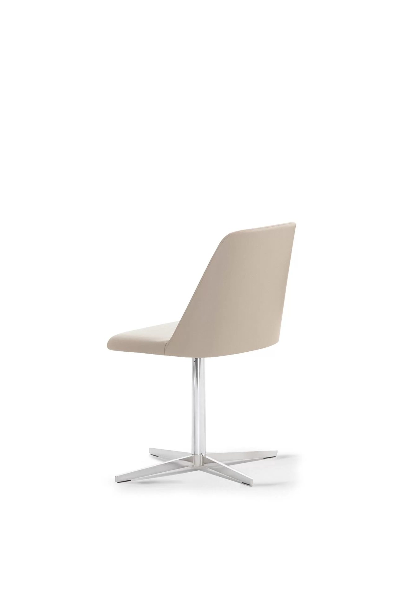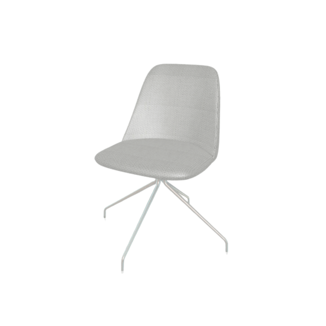 Swivel chair with 4 chrome metal legs. Upholstered and covered shell in Premium Eco leather, Bouquet fabric, Gourmet fabric, Nordic fabric, Pure Virgin Wool, Supreme Velvet and Premium Nappa Leather. Also available in the version with quilted backrest (only for Nordic fabricand Premium nappa leather).