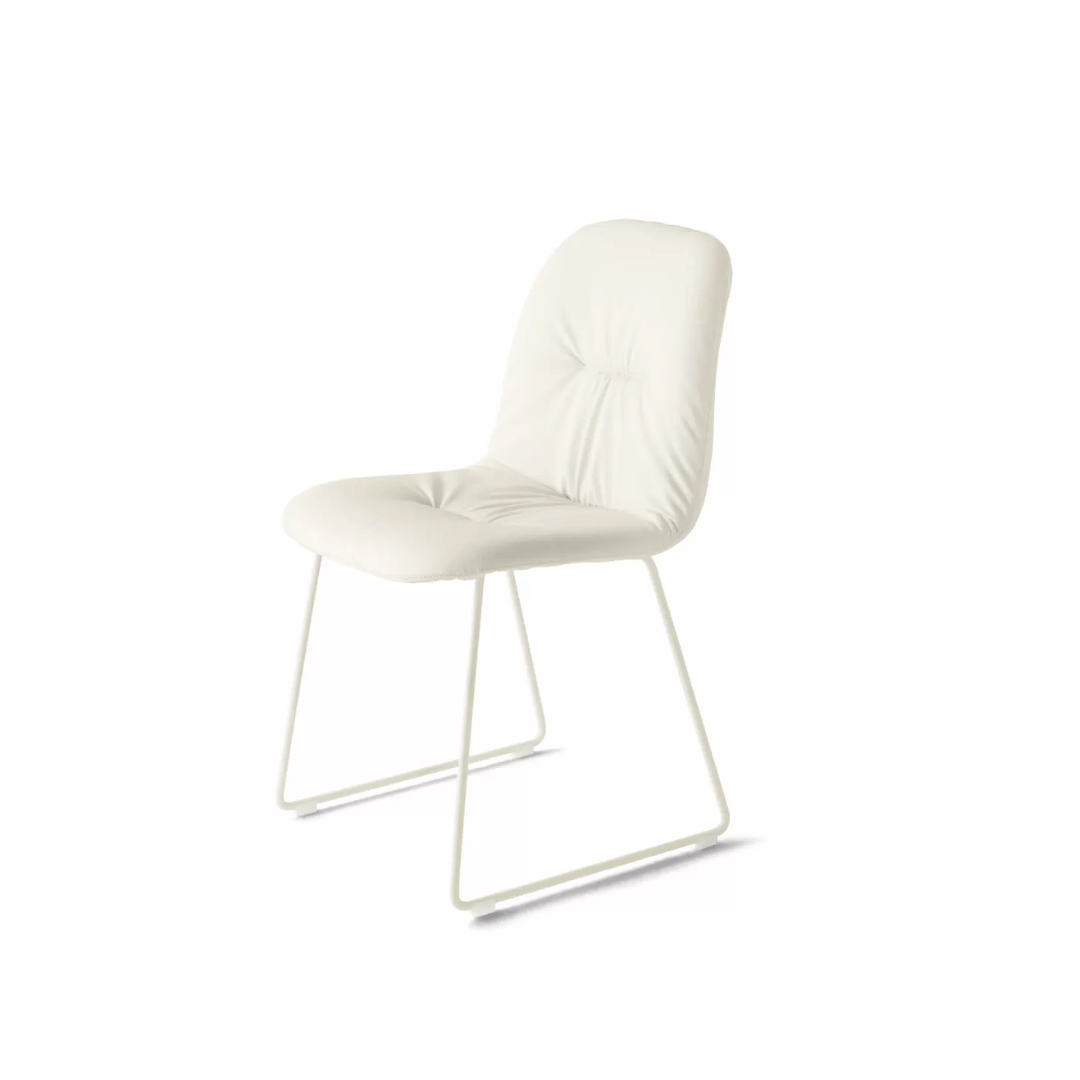 Chair with round rod metal frame. Upholstered and covered shell in Premium Eco leather, Bouquet fabric, Gourmet fabric, Nordic fabric, Pure Virgin Wool, Supreme Velvet, Kvadrat Field fabric, Coda Fabric and Premium Leather.