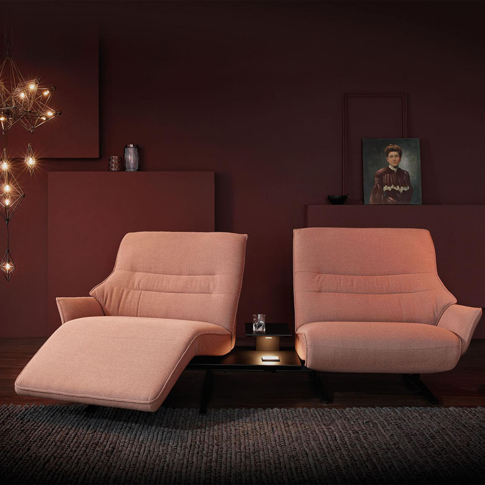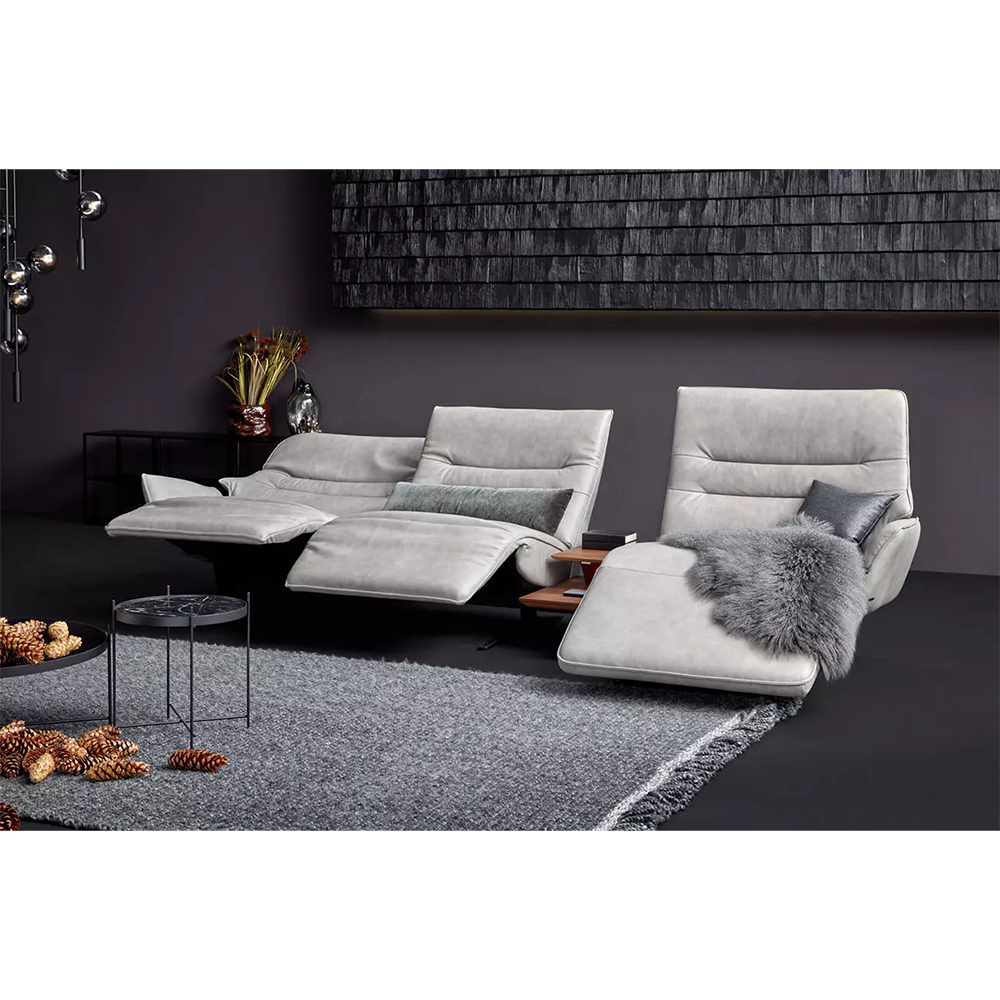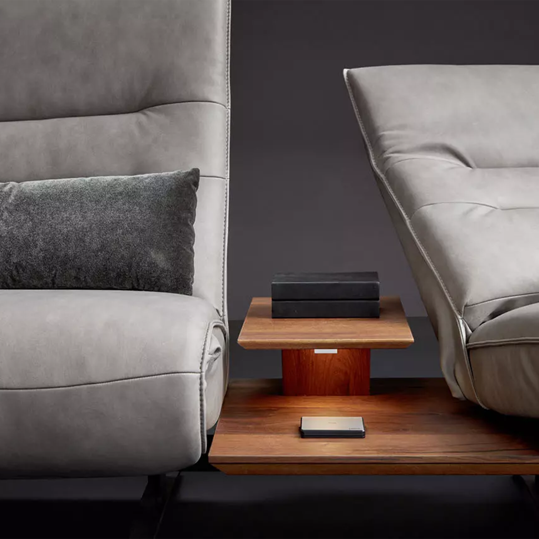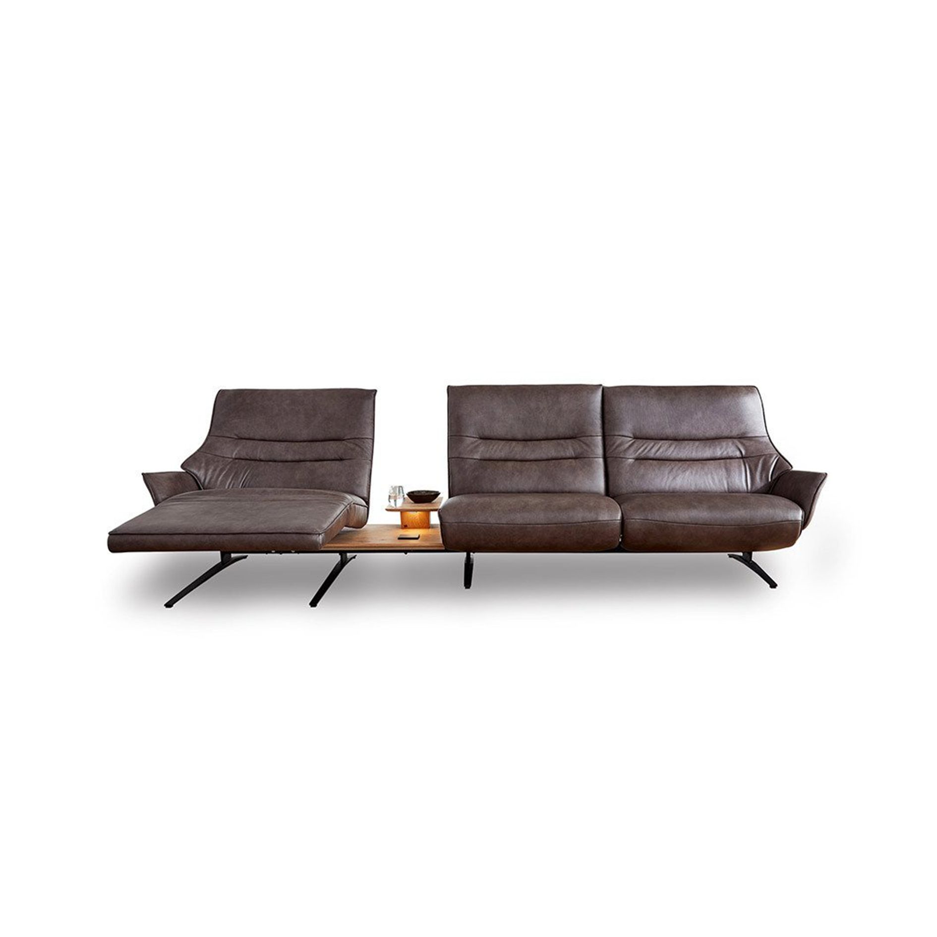 Sit comfortably or lie back and conveniently charge your phone: Lounger 4905 makes it possible. Choose a single sofa, a stylish trapezoidal solution or a corner sofa according to your requirements. This high-quality functional furniture in a modern look is also available as a free-standing recamier with a table. The swivelling seats provide flexible seating comfort. They can swivel up to 20° to the right and left. Further highlights are wooden table elements with lighting, an inductive charging station, a USB port and an integrated plug socket. Thus both you and your devices can “ recharge”.