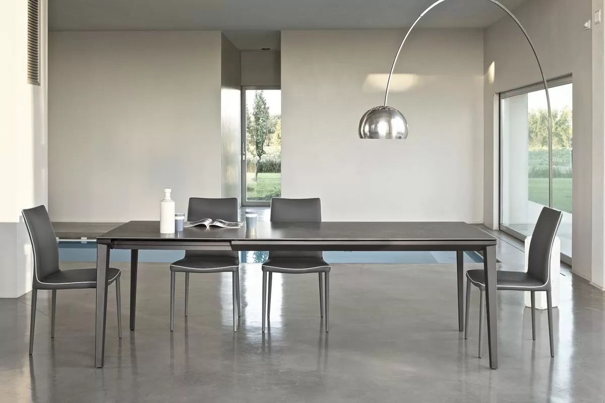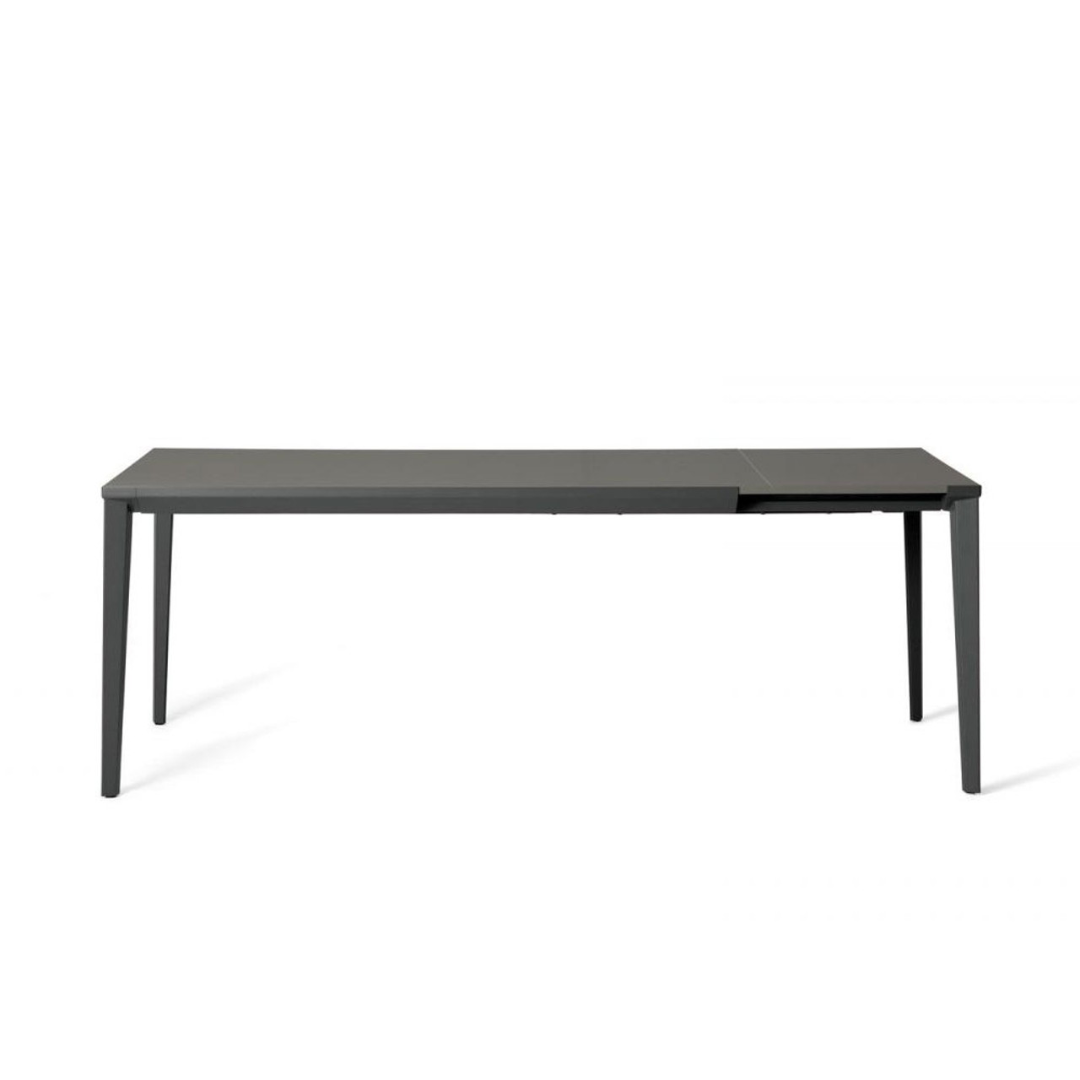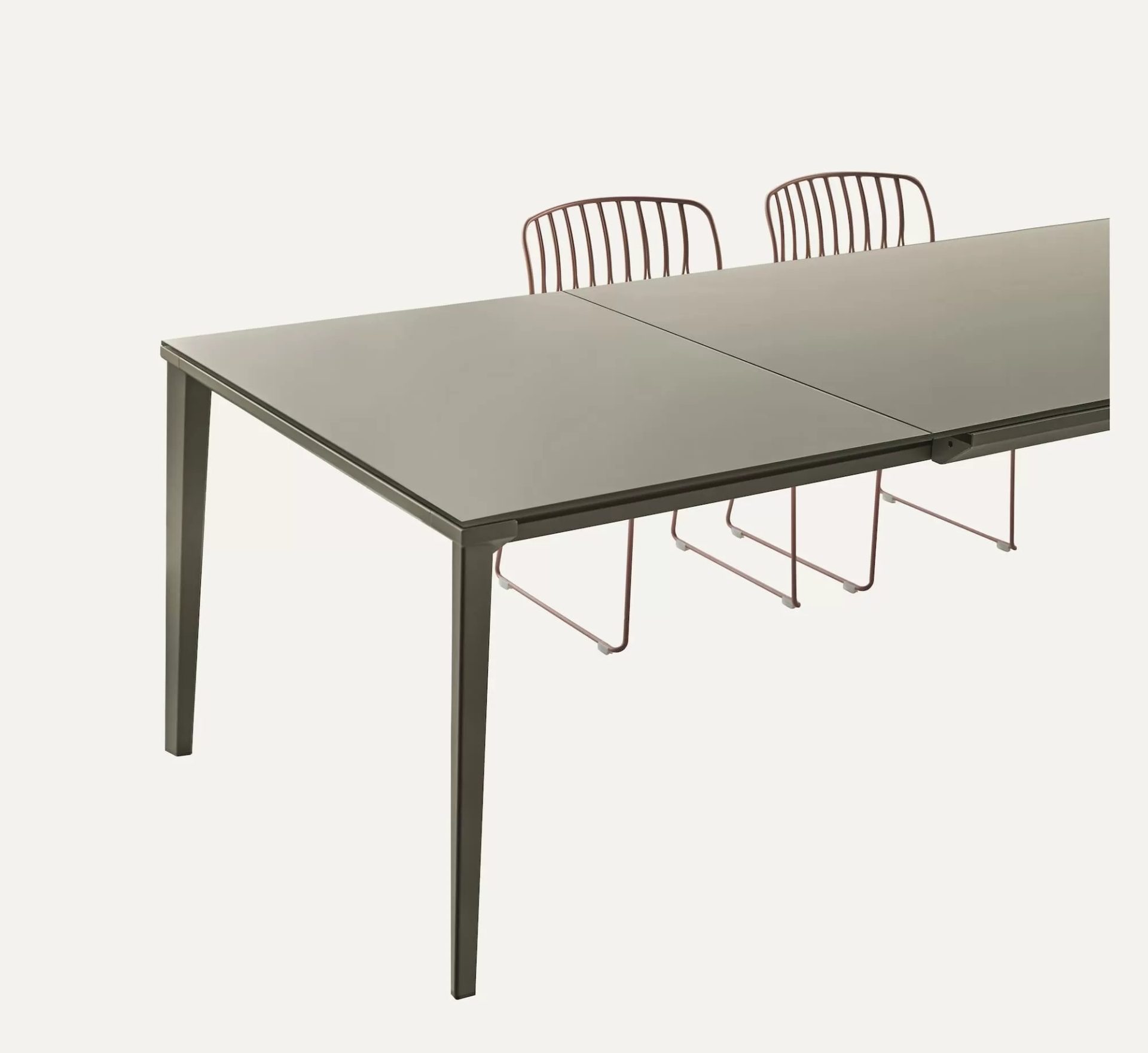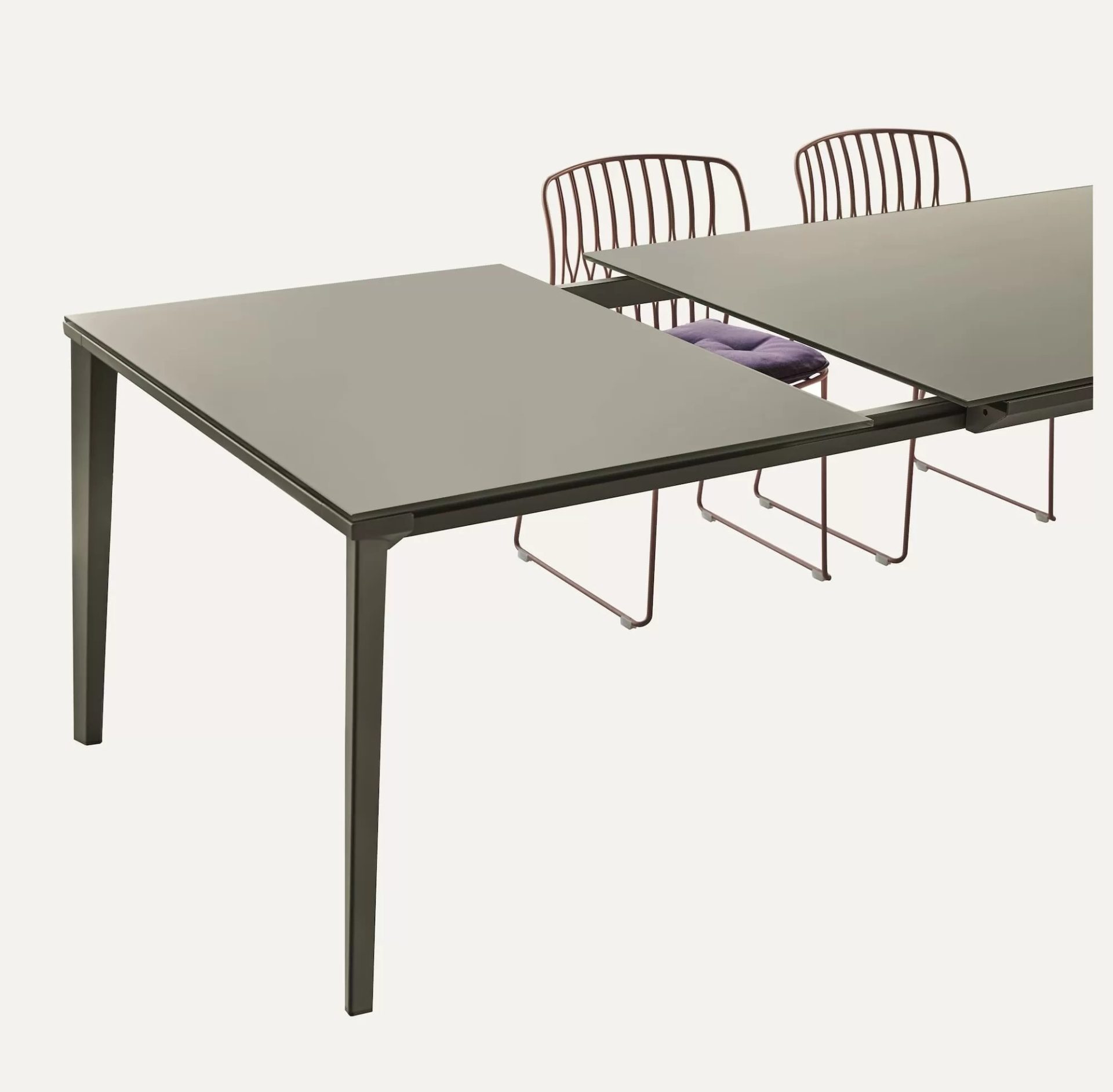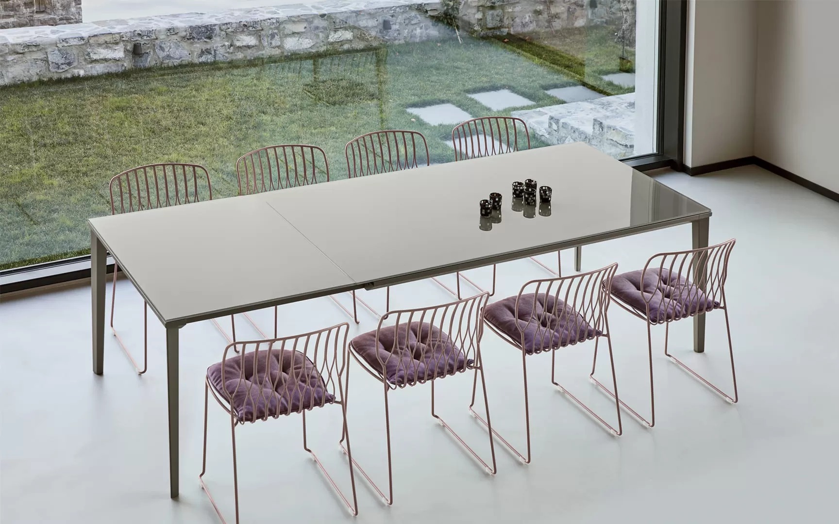 Table with extension and lacquered Metal frame. Top and extension in Glossy glass, Velvet matt anti-scratch lacquered glass, SuperCeramic or SuperMarble.
